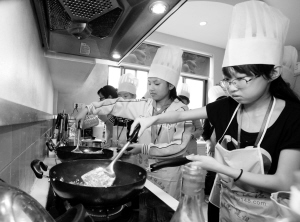 5月22日,小学生在厨艺实践室烧菜。当日,浙江省省级青少年法制教育基地——海宁市青少年空间组织祝场、盐官、丰士、郭店、周王庙等5所农村中心小学,开展“小学生法制厨艺实践日”活动。学生们在社工指导下结伴买菜、联手创意,将烧菜与法制教育结合在一起。 (新华社发 沈达 摄)