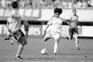 5月23日,中国队球员韩端(前右)在比赛中射门。当日,在成都举行的2010年亚足联女子亚洲杯小组赛B组最后一轮比赛中,中国队以1比0战胜澳大利亚队,从而以三战两胜一平积7分的战绩获得B组第一,晋级四强。