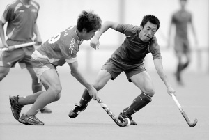 5月21日,内蒙古队球员苏立强(左前)带球进攻。当日,在甘肃兰州举行的全国男子曲棍球锦标赛第一阶段的比赛中,内蒙古队以4比0胜甘肃队。