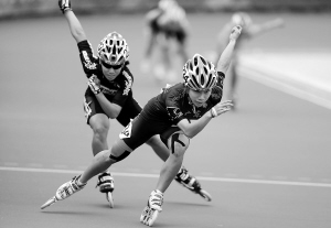 5月23日,广东队选手郭丹(前)在比赛中进行冲刺。当日,在第四届全国体育大会速度轮滑项目女子组场地赛1000米计时赛决赛中,郭丹以1分31秒232的成绩获得一等奖。 新华社记者 王雷 摄