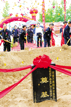 本报讯(记者 李硕)5月22日上午,河南万果园集团有机农产品生产加工物流产业园在商水县开工奠基。全国人大农业与农村工作委员会委员、十届河南省人大常委会常务副主任、党组书记王明义,市委书记毛超峰出席开工仪式并为工程奠基。