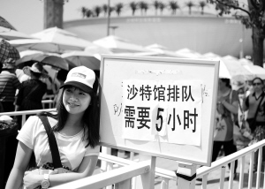 5月25日,世博园沙特馆排队入口提醒参观者,等候时间将达5小时,一位姑娘在提示牌旁拍照留念。当日,许多热门场馆排队时间均超过3小时。 新华社记者 郭磊 摄