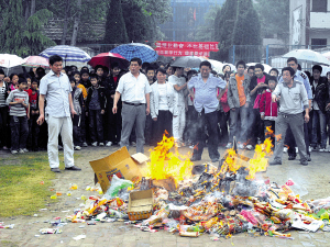 为了确保学校周边摊店食品卫生和校园食品安全,近期,鹿邑县教体局安全工作督查组联合工商部门对全县各乡镇中小学周边食品安全环境进行了专项检查。在检查中,执法人员对销售“三无”食品的摊点和小卖部予以查处,并收缴、焚烧所售“三无”食品。另外,执法人员还在学校门口用小喇叭提醒学生如何鉴别“三无”食品,切勿购买“三无”食品、假冒伪劣食品及过期食品。同时告诫学校周边经营户,要搞好校园周边卫生,为学生提供一个安全、卫生的学习生活环境,对于违反有关规定的,将依据有关法律法规予以查处。图为在贾滩一中焚烧“三无”食品。 (滕广忠 丁跃骅 摄)