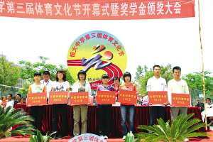 5月23日,伴随着恒大中学第三届体育艺术节的开幕,恒大中学“2009-2010学年下学期期中考试许家印奖学金颁奖大会”隆重举行。521名同学受到表彰,分别获得50~1000元不等的奖金和奖品。全校4000多名师生和学生家长再次见证了恒大中学创办者、中华慈善家许家印先生“回报家乡、造福桑梓”的爱心。(李成庆 摄)