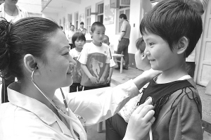 8岁的曹涛面对准备为他检查的“白大褂”时,显得很害怕,一步也不敢向前。“不打针,不吃药……”在老师和医生的软语“承诺”下,他才愿意接受医生的检查。检查结束后,兴奋的他冲着记者做起了鬼脸。