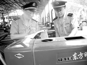 : 昨日,太康县工商局执法人员正在检查四轮拖拉机质量。为确保“三夏”生产顺利进行,连日来,太康县工商局组织执法人员对全县的农资、农机具经营市场,农资经营门店,农村加油站点进行了拉网式检查,严厉查处经销无厂名厂址、无合格证的“三无”拖拉机及配件等违法行为,确保“三夏”生产顺利进行。(王慧星 许晓宁 摄)