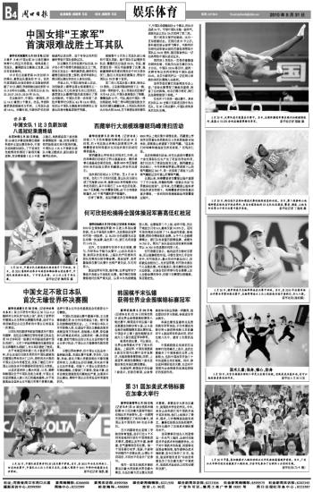 此外,在当晚举行的男子自由体操、鞍马、吊环和女子跳马决赛中,山东队的黄玉国、陕西队的张宏涛、上海队的严明勇和天津队的蒋彤分别夺得金牌。奥运冠军、老将滕海滨在鞍马比赛中出现严重失误,仅名列第六。