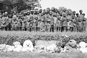 5月29日,在距捷克首都布拉格20多公里的利迪策村,参观者在儿童雕像群前摆放可爱的毛绒玩具,献给那些未能享受到和平生活便早早离开世界的利迪策村儿童。
