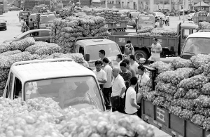 “大蒜之乡”鲜大蒜一天一个价 6月1日,来自全国各地的蒜商聚集金乡大蒜交易市场。连日来,在“大蒜之乡”——山东省金乡县,鲜大蒜陆续上市。由于前期蒜价高企,鲜大蒜一上市就引来大批蒜商聚集金乡“炒蒜”。金乡鲜大蒜收购价已从上市初期的约每公斤4元,攀升到现在的每公斤4.6元左右,而去年同期的价格约为每公斤0.4元。中小蒜商从蒜农手中收购的鲜大蒜,运到不足10公里的金乡大蒜交易市场,再卖给蒜商时,每公斤能卖到6元左右。由于目前鲜蒜市场缺乏相应的指导价格和监管措施,大批蒜商互相串通,囤货不卖,造成鲜蒜价格不断上涨,出现一天一个价现象。 新华社记者 范长国 摄