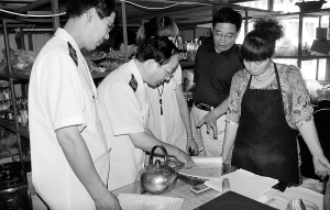 高考即将举行。近日,市卫生监督处执法人员对各考点和考务人员接待单位进行检查,做好考生食宿接待单位的食品卫生安全保障工作。(记者 王映摄)