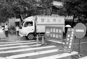 6月6日,警察在成都市石室中学高考考点前竖起交通管制的标志。当日,许多即将参加高考的成都市考生,前往自己考试的考点学校熟悉考场。成都市交警为方便考生熟悉考场,对交通进行了管制。