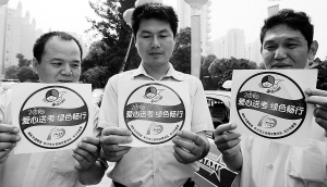 图②:长沙启动“爱心送考”活动 图为6月6日拍摄的在“爱心送考”活动启动仪式现场刚刚领到“爱心送考绿色通行证”的几名长沙出租车司机。
