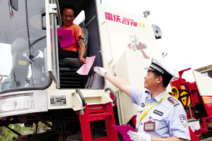 随着过境跨区作业大型联合收割机南下的陆续增多,我市公安交警部门及早动手,采取增派警力、开辟绿色通道、警车引导、发放“城区交通示意图”、在环城主干道交通路口设置跨区收割机服务点等方法为过境麦客提供24小时交通护导便利服务,热心帮助解决他们路途中遇到的困难和问题。