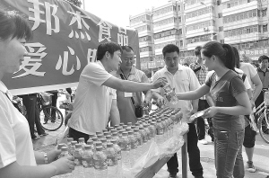 在市区一高考点,一些企业设立爱心服务点向考生免费提供矿泉水。(记者 王映摄)