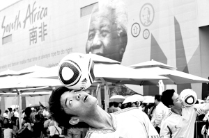 6月11日,在南非馆前,一位表演者在表演“花式足球”。当日,2010南非世界杯开幕。在世博园南非馆前,一些足球技艺表演者上演了一场“花式足球秀”,吸引了许多游客观赏。