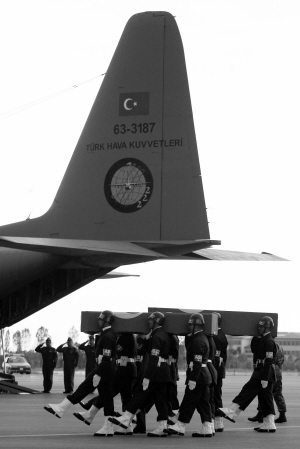 土耳其军方为哨所遇袭事件遇难士兵举行追悼会 6月20日,在土耳其东部的凡省,土耳其军人将捐躯士兵的棺材抬入运输机。6月19日凌晨,250名库尔德工人党武装分子从伊拉克北部越境进入土耳其东南部,分成三路袭击了土耳其与伊拉克接壤的哈卡里省谢姆丁利镇的一个军事哨所,双方激战5个小时,导致11名土耳其士兵死亡,16人受伤,12名反政府武装分子被击毙。20日上午,土耳其军方在靠近哈卡里省的凡省为牺牲的士兵举行了庄严的追悼会。