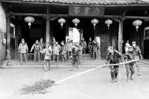 图④:福建泰宁:抢救全国重点文物保护单位尚书第建筑群 连日来,福建泰宁县遭遇特大暴雨灾害,这个县的全国重点文物保护单位泰宁尚书第受灾严重。图为武警福州指挥学院的400多名官兵正在现场清理积水和淤泥,极力抢救受损文物。