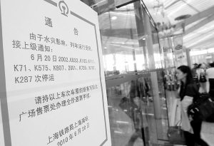 图③:南方暴雨致上海铁路客运受阻 6月20日,上海南站车站值班室张贴了列车停运通告。当日,受南方暴雨影响,从上海南站发往福州、南昌、贵阳等方向的11趟列车停运,大量列车晚点,近8000名旅客需办理退票手续,两万多名旅客出行受阻。