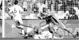 6月20日,巴拉圭队球员贝拉(上)射门瞬间。当日,在南非布隆方丹自由州球场进行的南非世界杯F组比赛中,巴拉圭队对阵斯洛伐克队。 新华社发