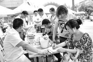 ①只要市中心血站的采血车停到人民商场门前的采血点,就会有不少市民捋袖伸臂献血。据中心血站血源科负责人介绍,截至目前,我市累计已有20多万人次无偿献血。我市是卫生部、中国红十字总会表彰的第一批“全国无偿献血先进城市”之一。(记者 王映摄)
