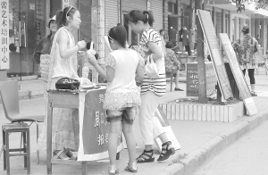 昨日,一位母亲在暑假辅导班招生点咨询。暑假将至,市区的街头出现了很多假期学习班招生广告和咨询台,家长们也开始为孩子挑选假期学习班忙碌起来。(记者 孙安平摄)