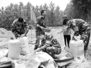 今年,商水县位集镇成立了由人大代表、基干民兵、工商联会员组成的“三夏”帮扶队,至今已无偿帮助过1000多家缺少青壮劳动力的农民家庭。图为帮扶队正在为农户装粮的情形。