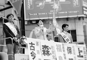 日本:各党党首发出参院选举“第一声” 6月24日,在日本首都东京街头,日本社民党党首福岛瑞穗(中)带领候选人在向选民拉票。当日,日本发布第22届国会参议院选举公告,为期17天的参议院竞选活动正式揭开序幕。 新华社记者 季春鹏 摄