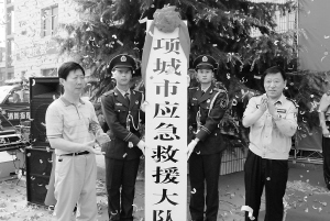 6月18日,项城市长邹洪(左),副市长、公安局长周运杰(右)为项城市应急救援大队揭牌。项城市应急救援大队依托公安消防大队组建而成,主要处理一些突发事件。记者 张猛 摄