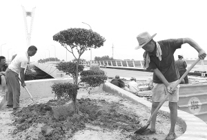 昨日,工人们在市区大庆路桥头栽种树木。大庆路桥即将通车,工人们在抓紧时间进行工程收尾工作,新桥将成为我市的一大景观。