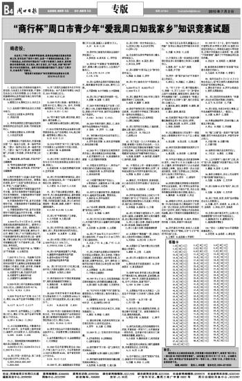 在全市上下深入实践科学发展观、投身追赶跨越式发展宏伟蓝图之际,我市迎来了建市十周年,这是一个崭新的发展机遇,又是一个新的起点。为更好的引领全市广大青少年爱周口、知家乡,团市委联合市委宣传部、市文明办、周口日报社、市广电局,开展“商行杯”青少年知识竞赛活动。现将书面竞赛试题刊登如下,欢迎广大青少年、社会各界广泛参与。