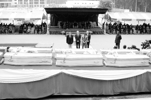 刚果(布)为6月19日空难遇难者举行遗体交接仪式 7月7日,在刚果(布)首都布拉柴维尔的议会大厦前,刚果(布)政府为6月19日在该国境内发生的飞机坠毁事故遇难者举行遗体交接仪式,正式将包括澳大利亚矿业大亨、森丹斯资源有限公司主席肯·塔尔博特在内的11人遗体转交给澳大利亚、美国、英国和法国等国代表。新华社发