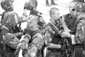 图②:7月9日,上阵前的中方士兵在往脸上涂油彩,进行隐蔽伪装。