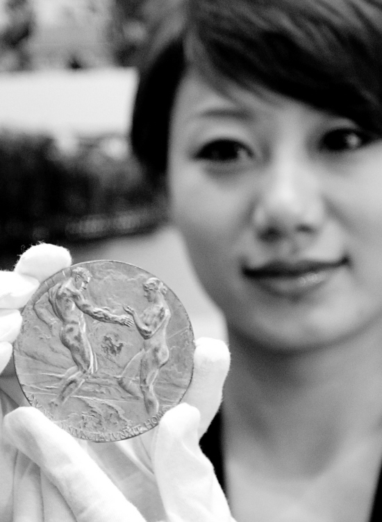 “95岁”金质奖章与世博会再续前缘 7月10日,工作人员在展示“95岁”的世博会金质奖章。当日,上海世博会山东周“烟台日”启动。一枚拥有95年历史,原藏于烟台张裕酒文化博物馆的世博会金质奖章,在上海世博会山东馆亮相,与世博会再续前缘。据了解,这枚奖章是中国民族企业在1915年旧金山世博会上赢得的奖牌之一,堪称一个世纪前“中国制造”走出国门的象征。