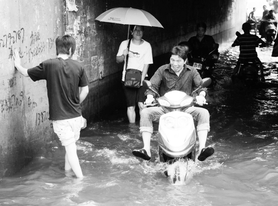 武汉持续暴雨 部分地段滞水严重 7月11日,市民在武昌一处滞水路段涉水过路。当日,武汉地区遭遇持续暴雨袭击,造成城区部分地段滞水严重,交通发生堵塞,给市民出行带来不便。