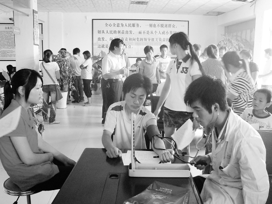 7月9日上午,来自商水县袁老乡的几名返乡农民工正在接受免费健康检查。为提高返乡农民工的健康水平,该县定期组织医务人员对返乡农民工进行免费体检,以达到促进返乡农民工健康就业的目的。刘飞 摄