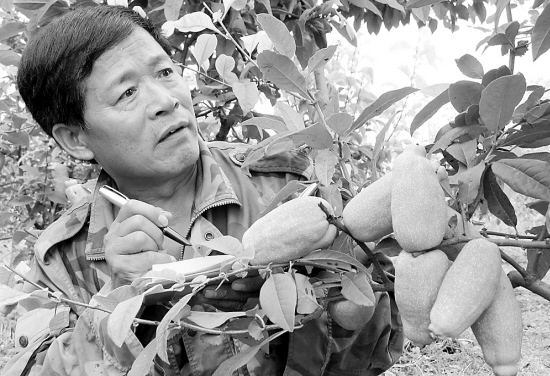 近年来,鹿邑县积极发展中药材种植业,初步形成了以白芍、丹参、红花、党参、木瓜种植为主的“五药基地”,为农民增收架起了桥梁。图为鹿邑县高级中药技师王令军正在察看木瓜的生长情况。 胡海云 胡洪涛 摄