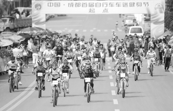 7月11日,自行车爱好者在女子组比赛中骑行。当日,成都首届自行车车迷健身节在成都双流县举行,来自四川省内外近千名自行车爱好者欢聚一堂,切磋车技,体验自行车运动的乐趣。 新华社记者 江宏景 摄