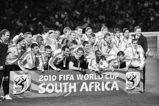 7月10日,德国队全体在颁奖仪式上合影。当日,在伊丽莎白港举行的2010年南非世界杯季军争夺战中,德国队以3比2战胜乌拉圭队,获得季军。 新华社记者 杨磊 摄
