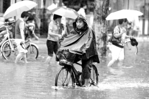 7月12日,一名合肥市民在雨中骑行。安徽省气象台7月12日10时30分发布暴雨橙色预警。据预报,未来3小时内江淮之间和沿江大部分地区降雨量将达50毫米以上。 新华社记者 郭晨 摄