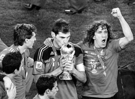 7月11日,西班牙队门将卡西利亚斯(中)亲吻“大力神杯”。 新华社记者 陈海通 摄