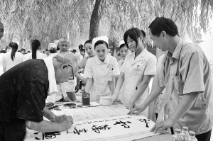 7月7日,郸城县20多名老年书画家云集县人民医院,为医务人员现场义写义画。据了解,近两年来,县人民医院多次为老年人免费进行健康体检,建立健康档案。为答谢医务人员的爱心,县老年书画协会组织了这次义写义画活动。(孙小明 摄)