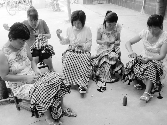 图为商水县舒庄乡扶苏村几名留守妇女正在加工披肩。今年以来,该乡与深圳一家外贸公司签订了披肩加工合同,加工的披肩出口到阿拉伯一些国家。目前,该乡3000多名留守妇女在家门口从事披肩加工,人均月收入800多元。(乔连军 摄)
