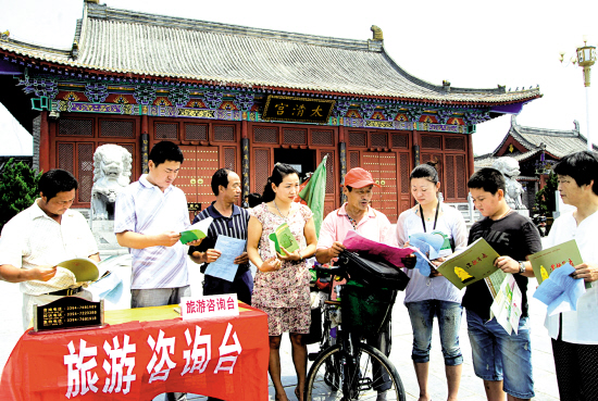 近年来,鹿邑县积极推行低碳旅游、生态旅游,切实促进了老子故里旅游业整体素质的提升。图为7月14日,骑单车走遍中国的“环保勇士”——安徽省宿州市61岁的农民周圣凤(右四),与当地旅游部门人员在太清宫景区向过往游客宣传低碳、环保知识。(沈力 蒋保庆 摄)
