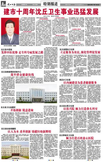 10年飞速发展,10年民众安康。建市十年来,沈丘县的卫生事业在县委、县政府的正确领导下,在县人大、县政协的监督指导下,在社会各界的关心帮助下,以科学发展观为统领,以深化卫生体制改革为总抓手,以医疗救治、疾病控制、卫生监督三大体系建设和人才培养为切入点,内强素质,外树形象,以精湛的技术,优质的服务为广大人民群众服务,在保护人民身体健康,提高群众素质,促进经济发展等方面取得了显著成绩,得到了迅猛发展。