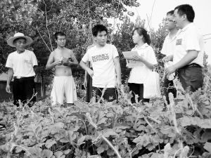 河南农大支农服务团在当地村民的介绍下,对常营镇和寨村蔬菜大棚种植、五子李村西瓜生产进行了深入的考察学习。当了解到当地农民在西瓜种植过程中遇到的难题时,支农服务团成员立即利用自己获得的课本知识给瓜农讲解了有关西瓜幼苗的培育以及一些常见的病虫害生物防治方面的知识。“为了把学到的理论知识和实际充分结合,我们在当地农民的指导下进行实践操作,学会了怎样授粉,以及在雨天怎样防止刚授的花粉被雨水冲洗掉。”该服务团成员告诉记者。