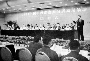 9月28日至30日,由《经济日报》和周口市委、周口市人民政府共同主办的2003年中国中西部农业发展高层论坛在周口饭店隆重举行。会议的主题是探讨在新形势下如何加强中西部合作,实现区域经济优势互补,推进农村经济结构战略性调整,从而从根本上解决“三农”问题,促进农村经济持续、快速、健康发展。与会专家就经济发展与“三农”问题及主要对策、小农户与大市场大农业关系、传统农业区农产品的加工和转化等进行广泛深入的探讨。