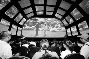 7月16日,游客在信息通信馆“无限梦想剧场”里观看展示未来通信技术的影片。