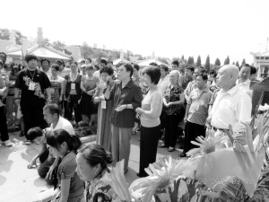 7月18日~20日,来自全国各地的近百名戏迷网友和越调名家齐聚周口,纪念申凤梅大师逝世15周年。图为项城望陵园祭拜现场。 (记者 王映 摄)