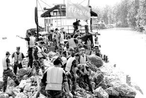 南京军区“硬骨头六连”所在师鏖战九江 “硬骨头六连”所在师工兵营官兵在九江棉船镇崩岸险情水域抛石固岸(7月19日摄)。连日来,江西长江九江段、鄱阳湖区、昌江纷纷超警戒水位。 面对严峻险情,1998年抗洪抢险中曾创下用血肉之躯封堵九江大堤决口奇迹的南京军区“硬骨头六连”所在师3800名官兵,从7月16日接到命令千里机动奔赴灾区一线,到22日已经连续7个昼夜鏖战九江,处置了一处处险情…… 新华社发
