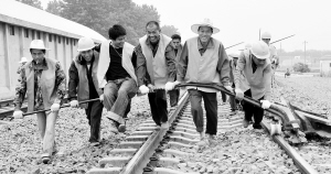 昨日,工人们正在漯阜铁路沈丘段电气化改造工程工地紧张施工。该工程全长27公里,涉及三站六乡,总投资约6亿元。目前,沿途的拆迁、基建等工作已经完成,工程进展顺利。(董国俊 摄)
